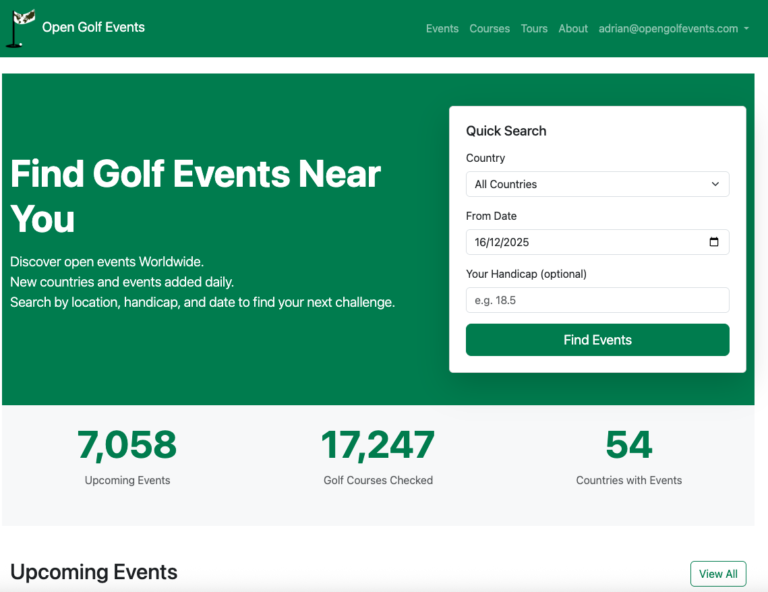 There are around 40,000 golf courses in the world and it would seem crazy to try and catalogue them all, and even crazier to then look on all their websites on a weekly basis to see if they’ve got any new ‘open’ events. Well in this modern world of AI, it’s not as crazy as it seems. I’ve still got a way to go cleaning the data, and introducing the site to the world, but here it is if you want a preview before we launch properly in the Spring…
